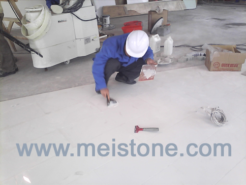 应深圳广田装饰集团公司邀请,今天我公司员工带上先进的美石石材打磨翻新机来到位于广东顺德北滘的美的 集团总部办公大楼。对微晶石地面进行整平磨抛处理。(如下图)如今,石材护理不单只要求大理石平整度、光亮 度、晶面厚度,人造石、微晶石的铺贴平整度也是石材安装的一个首要验收标准。如美的总部的微晶石地面就是一 个标准--要求相当高的平整度。微晶石翻新磨抛