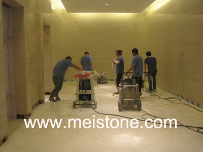 以常见抛光砖为例,抛光砖的翻新方法与大理石基本相同,但需要采用重型石材翻新机(如美石石材翻新机)配合50#----3000#的水磨片打磨七道程序,最后采用花岗岩的抛光方法进行低速、低压力抛光,然后做水性防污剂的防污处理,最后晶面处理。晶面处理时必须采用中性的抛光砖专用晶面剂处理,如果采用酸性的大理石晶面浆、晶面泥、晶面剂等会导致抛光砖表面不清晰、虽说有一定的光度,但相当模糊,有一种物体表面被抹油一样的月朦胧的感觉,只有采用中性抛光砖用晶面剂后才会出现原来抛光砖出厂时的高光的、镜面的、清晰的效果。抛光砖的翻新也可以采用微晶石的打磨翻新抛光方法,无需做晶面处理,但须做防护处理效果为最佳,甚至优越于新铺的抛光砖的亮度与抗污性能。